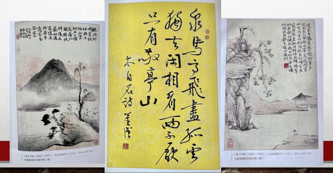在此背景下,董强教授着重分享了《唐诗之路》里的插图。书中的插图大多来自国外的美术馆和博物馆收藏,都与诗歌意境有着紧密的联系。例如文中用两幅清朝华岳的画配李白的《独坐敬亭山》,在长幅画中截取“采莲女”局部细节配李白的《越女词》等。