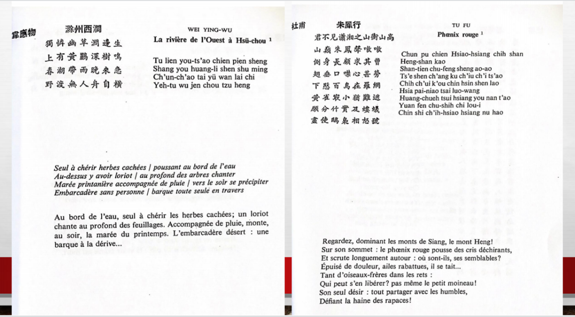 在书中,程抱一采取了在汉语原文与法语译文中间增加“忠实的”对等呈现的翻译方式,首次让法国读者直观地感受中文的语言质地,由此引发读者的自由联想,也带动了法国读者及知识分子对于唐诗的关注,这是一次专业汉学与想象汉学的完美融合。