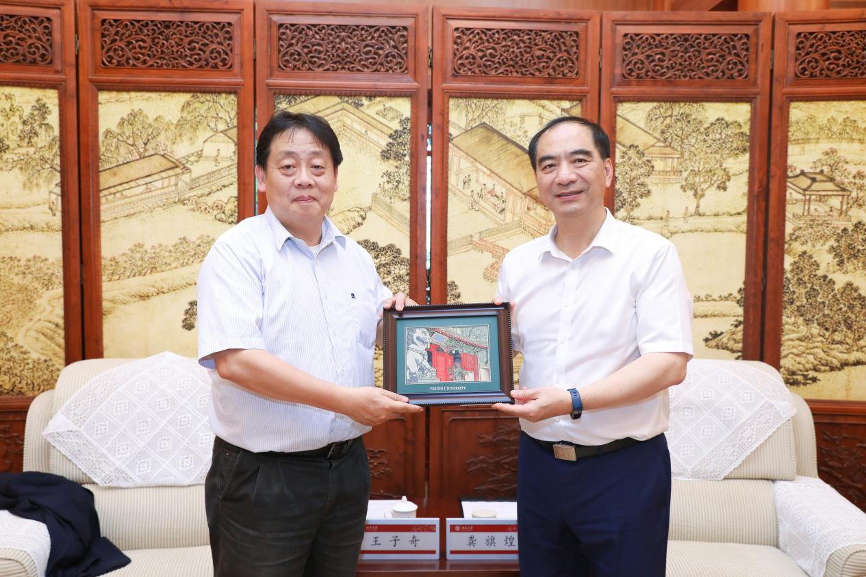 7月23日,中国文化大学校长王子奇率团访问北京大学。北京大学校长龚旗煌会见王子奇一行,党委常委、副校长方方等陪同会见。