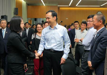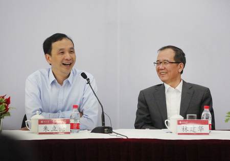 随后,在光华管理学院举行了中国国民党主席朱立伦先生与北京大学师生座谈会。北京大学校长林建华在欢迎辞中表示,朱立伦先生是北京大学师生熟知的人物,也是财会领域的杰出学者。近年来朱立伦先生不辞辛苦,多次接待赴台交流的北大师生,关心支持北京大学与台湾各界的交流合作。他表示,北京大学一直以来十分重视海峡两岸的学术交流与合作。截至目前,北大已与台湾大学、中研院等17所台湾高等院校和学术研究机构建立了形式多样、内容丰富的交流合作关系。北京大学还是最早面向台湾地区招生的大陆高校之一,早在1979年,北大就开始招收台湾学生。目前,共有468名台湾学生在北大攻读学位,每年还有近百名台湾交换生在北大交换学习。他鼓励在座的青年学生学习朱立伦勤勉求学的精神,在两岸教育、学术和文化交流中发挥重要作用。