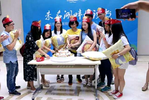 鲜香的水果,可口的美食……港澳台暑期学校的学子齐聚第二体育馆地下礼堂,共享联谊餐会。北大港澳台办公室的老师再次欢迎同学们的到来。香港城市大学周悠同学作为学生代表,上台分享了在北大的见闻与收获,同时感谢港澳台办老师、项目辅导员的辛勤付出。同学们或畅谈在北大的点点滴滴,或展示自己的横溢才华。活动正酣,“陈可邦、刘夏凡……”主持人念出了13位同学的名字。正当被喊到名字的同学面面相觑时,生日祝福的歌曲响起,9名辅导员从人群后方推出“埋伏已久”的生日蛋糕,为13名当月生日的同学,献上了一份生日的惊喜。